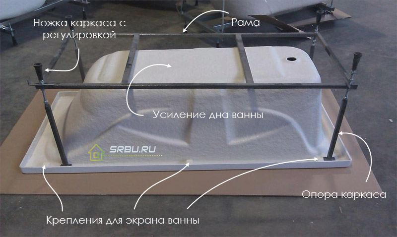 В независимости от используемого акрила, все ванны устанавливаются на специальную сварную или сборную металлическую раму, которая выполняет функцию основы и сдерживателя ванны от чрезмерной деформации при полном наполнении. При этом конструкция металлической рамы – каркаса, в какой-то степени также оказывает влияние на стоимость акриловой ванны.