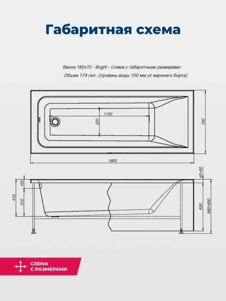 Акриловая ванна Aquanet Bright 180x70 создана с учетом растущего спроса на ванны простой прямоугольной формы в популярных размерах. Это модель с прямыми бортами и пологой спинкой, где соблюден идеальный угол для комфортного нахождения в ванне. Спинка плавно перетекает в бортик, поэтому релакс гарантирован даже без использования подголовника. Все линии ванны подчинены строгим законам эргономики. В современных условиях ширина ванны 70 см при длине 180 см - это наиболее востребованные габариты, так как прекрасно вписываются в стандартную планировку современных ванных комнат. Чаша в этой ванне устроена таким образом, что для обозначенных размеров в ней достигнут максимально возможный внутренний объем, а именно 174 литра, и это при комфортной глубине в 410 мм от слива ванны до борта. Ванна рассчитана на нагрузку свыше 300 кг, так что даже крепкий мужчина сможет без опаски находиться в ней. Двойной слой армирования обеспечивает надежность чаши, а закладные из МДФ-плит в местах наибольшей нагрузки усиливают эффект.