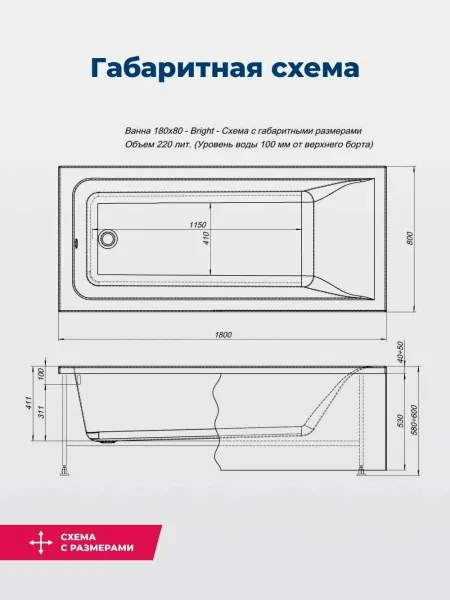 Акриловая ванна Aquanet Bright 180x80 создана с учетом растущего спроса на ванны простой прямоугольной формы в популярных размерах. Это модель с прямыми бортами и пологой спинкой, где соблюден идеальный угол для комфортного нахождения в ванне. Спинка плавно перетекает в бортик, поэтому релакс гарантирован даже без использования подголовника. Все линии ванны подчинены строгим законам эргономики. В современных условиях ширина ванны 80 см при длине 180 см - комфортные габариты, которые, к тому же, прекрасно вписываются в стандартную планировку современных ванных комнат. Чаша в этой ванне устроена таким образом, что для обозначенных размеров в ней достигнут максимально возможный внутренний объем, а именно 220 литров, и это при комфортной глубине в 411 мм от слива ванны до борта. Ванна рассчитана на нагрузку свыше 300 кг, так что даже крепкий мужчина сможет без опаски находиться в ней. Двойной слой армирования обеспечивает надежность чаши, а закладные из МДФ-плит в местах наибольшей нагрузки усиливают эффект.