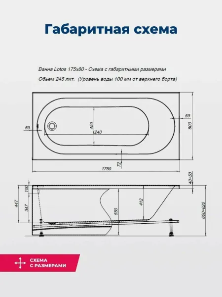 Акриловая ванна Aquanet Lotos 347160 175x80 см с каркасом и фронтальной панелью