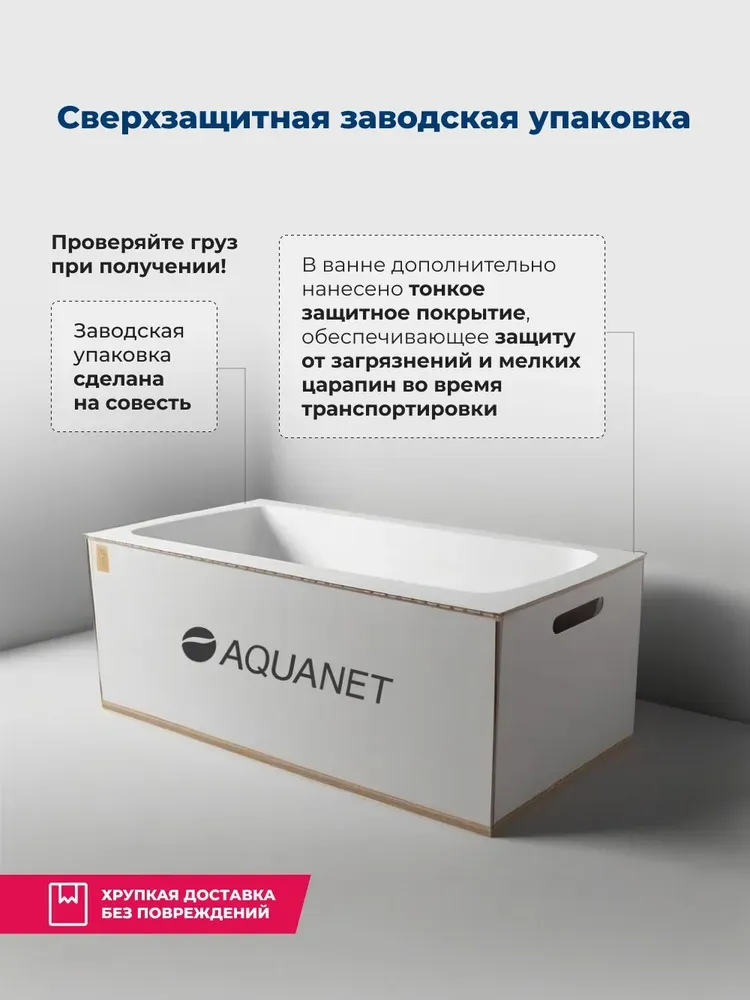 Обратите внимание, что это комплект: акриловая ванна, каркас и фронтальная панель. Ванна прямоугольная Aquanet Roma 170x70 выполнена в цвете «белый глянец» и имеет удобную форму. Ее глубина составляет 392 мм, благодаря чему ванна способна вместить в себя 159 литров воды. На днище ванны предусмотрено антискользящее покрытие, выполненное в виде небольших бугорков на поверхности. В изголовье предусмотрен подголовник. Прекрасный образец достойного качества в бюджетном воплощении. Ванна уже установлена на жесткий сварной каркас из металлического профиля. Металлические детали каркаса подвергаются трехступенчатой обработке, когда сначала профильная труба проходит абразивную зачистку на специальном станке, после чего готовые детали обрабатывают каустической содой, и, просушив, покрывают с помощью электростатического распылителя молотковой краской по металлу. Это гарантирует равномерность окрашивания и стойкость покрытия.