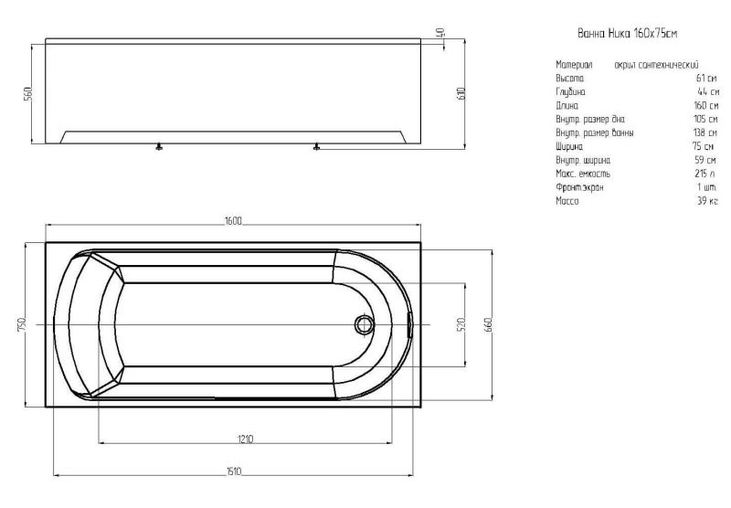 Габариты (Д Ш), см: 160х75Высота с опорой, см: 61Объем, л: 220 Форма: прямоугольнаяМонтаж: пристеннаяРасположение перелива: стандартноеДиаметр слива ванны, см: 5,2Материал: 100% литьевой акрилЦвет: белыйГарантия: 20 летСтрана: Россия Вид опоры: каркас сборно-разборный металлический (шпильки) или опорная конструкция (ножки), приобретается отдельноЭкран: фронтальный и боковой, приобретаются отдельноСлив-перелив: нет, приобретается отдельноНескользкая поверхность