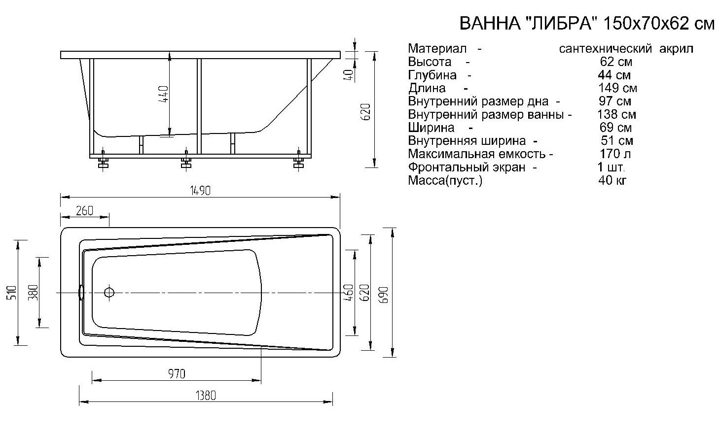 Габариты (Д Ш), см: 150х70Высота с опорой, см: 62Объем, л: 170 Форма: прямоугольнаяМонтаж: пристеннаяРасположение перелива: стандартноеДиаметр слива ванны, см: 5,2Материал: 100% литьевой акрилТолщина акрилового листа, мм: 4Гарантия: 20 летСтрана: Россия Вид опоры: каркас сборно-разборный сварной, есть в комплектеЭкран: фронтальный в комплектеСлив-перелив: есть, в комплектеНескользкая поверхность: даПодголовник: приобретается отдельноРучки: приобретаются отдельно Система гидромассажа: установка по желаниюАэромассаж: установка по желаниюХромотерапия: установка по желаниюРучки, поручни для ванны: установка по желаниюВстроенные смесители: установка по желаниюИзменение конструкции каркаса: установка по желаниюОзонирование: нет, установка не предусмотренаЗащита от сухого пуска: установка по желаниюУправление: любое по желанию