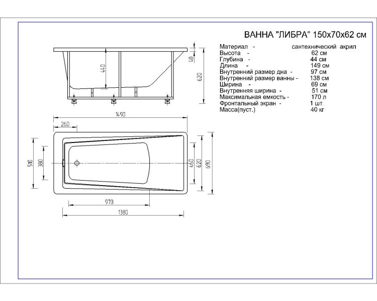 Габариты (Д Ш), см: 150х70Высота с опорой, см: 62Объем, л: 170 Форма: прямоугольнаяМонтаж: пристеннаяРасположение перелива: стандартноеДиаметр слива ванны, см: 5,2Материал: 100% литьевой акрилТолщина акрилового листа, мм: 4Гарантия: 20 летСтрана: Россия Вид опоры: каркас сборно-разборный сварной или опорные ножки, приобретаются отдельноЭкран: фронтальный и боковой, приобретаются отдельноСлив-перелив: приобретается отдельноНескользкая поверхность: даПодголовник: приобретается отдельноРучки: приобретаются отдельно Система гидромассажа: установка по желаниюАэромассаж: установка по желаниюХромотерапия: установка по желаниюРучки, поручни для ванны: установка по желаниюВстроенные смесители: установка по желаниюИзменение конструкции каркаса: установка по желаниюОзонирование: нет, установка не предусмотренаЗащита от сухого пуска: установка по желаниюУправление: любое по желанию