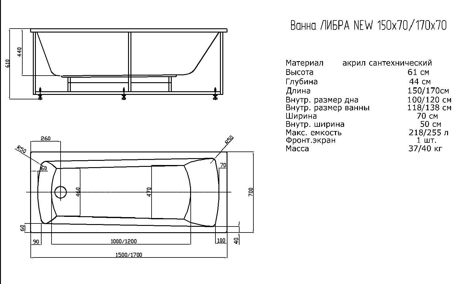 Габариты (Д Ш), см: 170х70Высота с опорой, см: 61Объем, л: 255 Форма: прямоугольнаяМонтаж: пристеннаяРасположение перелива: стандартноеДиаметр слива ванны, см: 5,2Материал: 100% литьевой акрилТолщина акрилового листа, мм: 4Гарантия: 20 летСтрана: Россия Вид опоры: каркас сборно-разборный сварной, есть в комплектеЭкран: фронтальный, в комплектеСлив-перелив: есть, в комплектеАнтискользящее покрытие: нескользкая поверхностьПодголовник: приобретается отдельноРучки: приобретаются отдельно Система гидромассажа: установка по желаниюАэромассаж: установка по желаниюХромотерапия: установка по желаниюРучки, поручни для ванны: установка по желаниюВстроенные смесители: установка по желаниюИзменение конструкции каркаса: установка по желаниюОзонирование: нет, установка не предусмотренаЗащита от сухого пуска: установка по желаниюУправление: любое по желанию