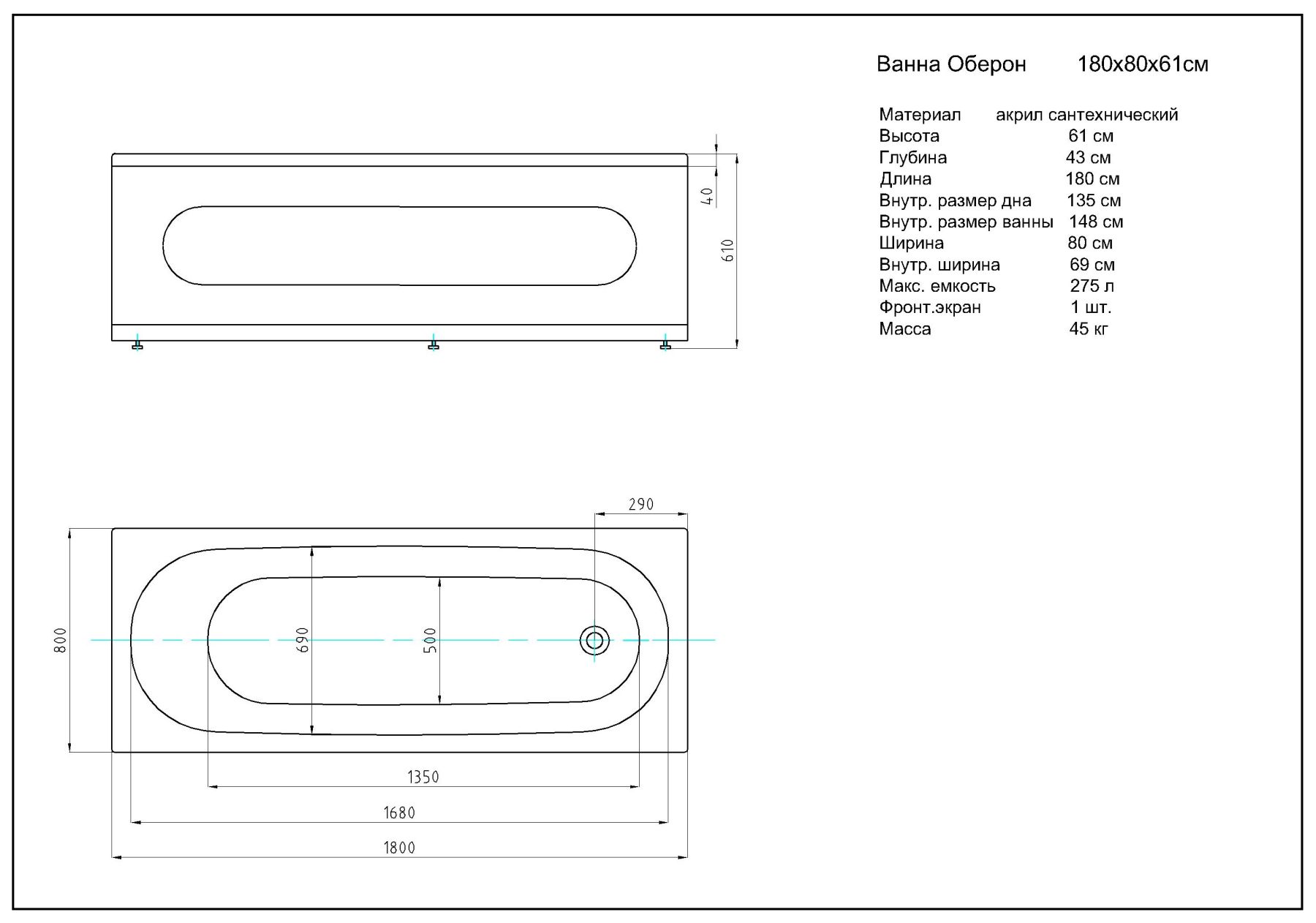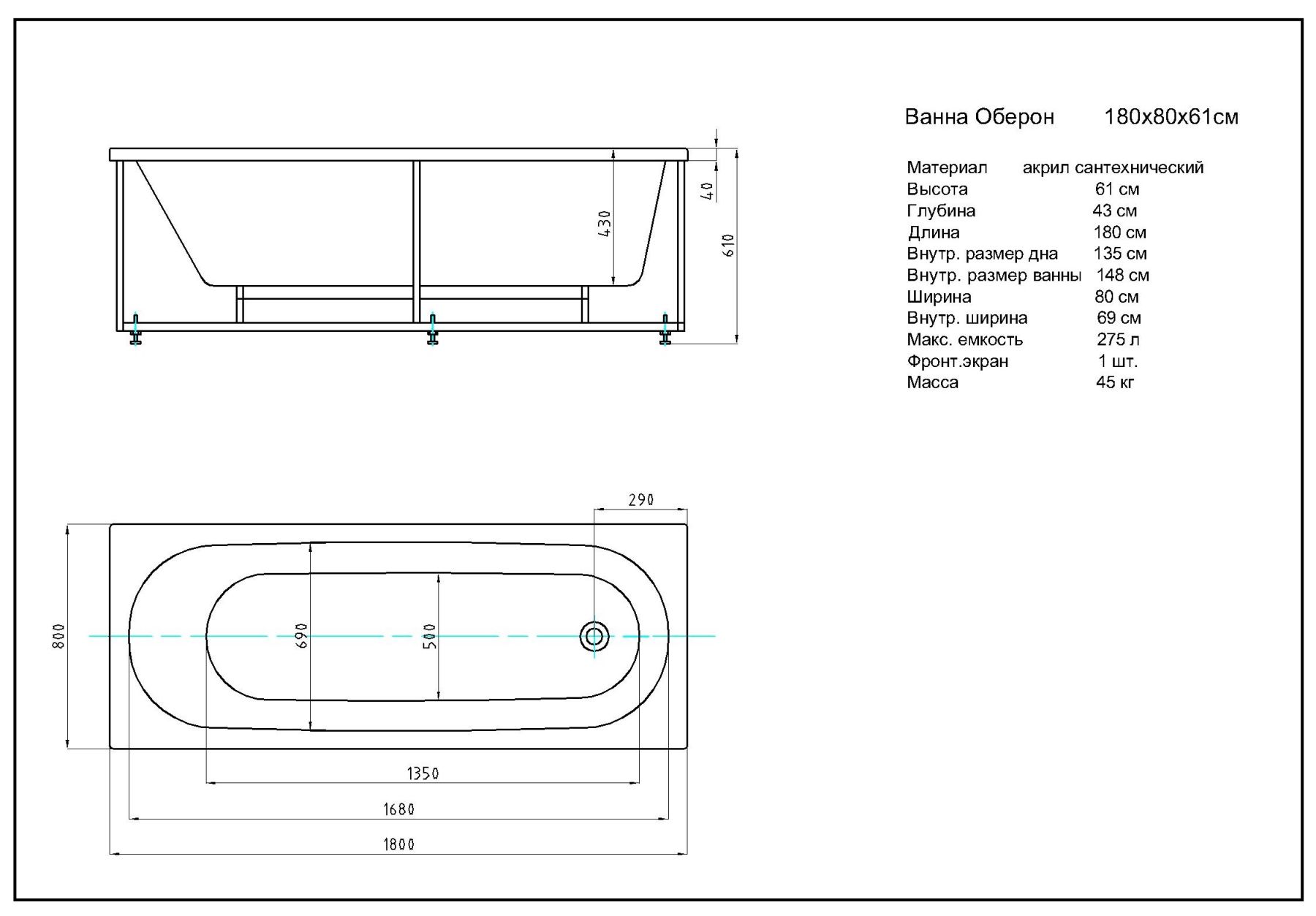 Габариты (Д Ш), см: 180х80Высота с опорой, см: 61Объем, л: 275 Форма: прямоугольнаяМонтаж: пристеннаяРасположение перелива: стандартноеДиаметр слива ванны, см: 5,2Материал: 100% литьевой акрилТолщина акрилового листа, мм: 4Гарантия: 20 летСтрана: Россия Вид опоры: каркас сборно-разборный сварной, есть в комплектеЭкран: фронтальный в комплектеСлив-перелив: есть, в комплектеАнтискользящее покрытие: нескользкая поверхностьПодголовник: приобретается отдельноРучки: приобретаются отдельно Система гидромассажа: установка по желаниюАэромассаж: установка по желаниюХромотерапия: установка по желаниюРучки, поручни для ванны: установка по желаниюВстроенные смесители: установка по желаниюИзменение конструкции каркаса: установка по желаниюОзонирование: нет, установка не предусмотренаЗащита от сухого пуска: установка по желаниюУправление: любое по желанию