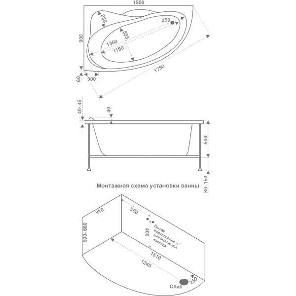 Слив-перелив:приобретается отдельноТолщина ванны, мм:4Серия:ГалантЦвет:БелыйКаркас:приобретается отдельноШирина, см:150Длина (Глубина), см:90Глубина, см:50