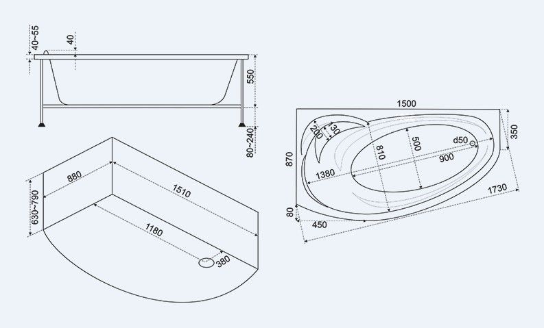Глубина ванны по центру: 480 мм