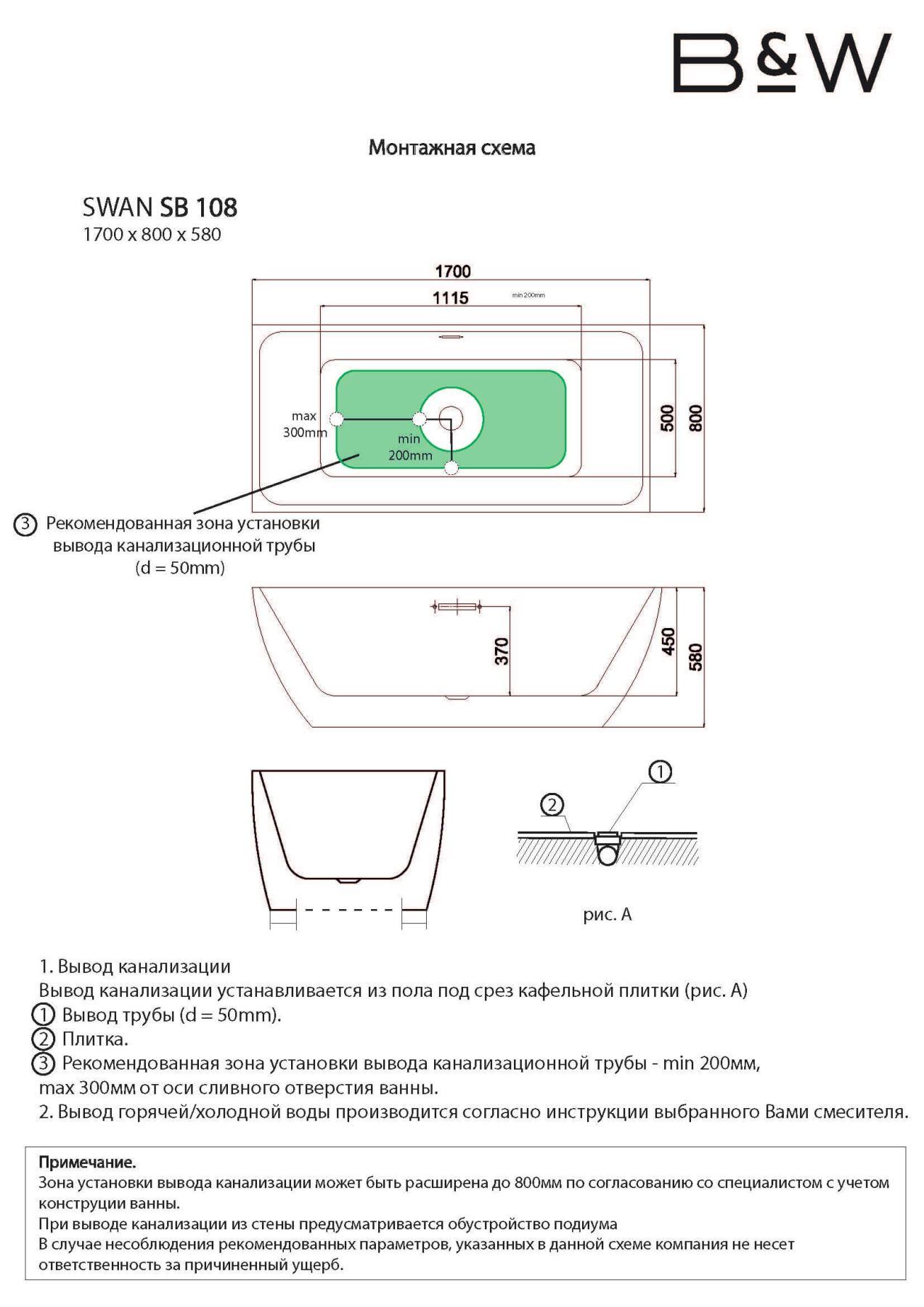 Акриловая ванна Black & White Swan 108SB00 170 x 80 см