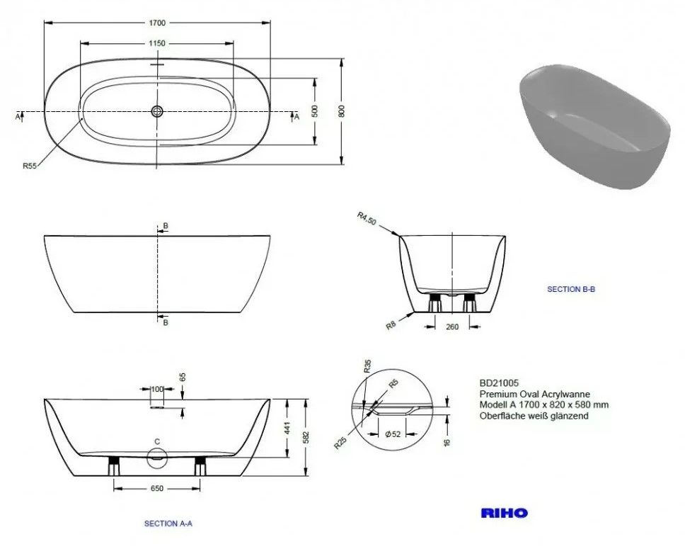 Отдельно стоящая овальная, глянцевая белая акриловая ванна RIHO Alpha 170х80 с тонкими двойными стенками, со встроенным переливом.