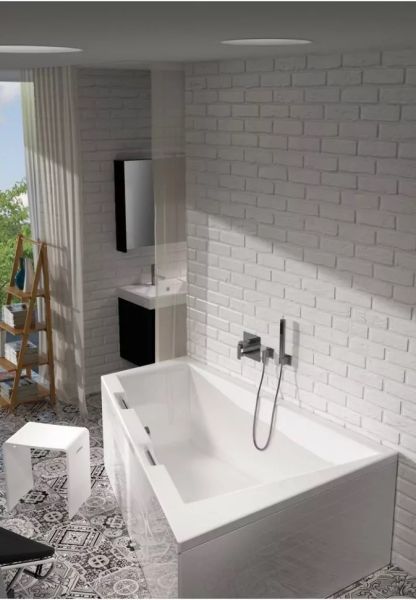 Две хромированные ручки, встроенные в бортик ванны, придают ей роскошный вид.