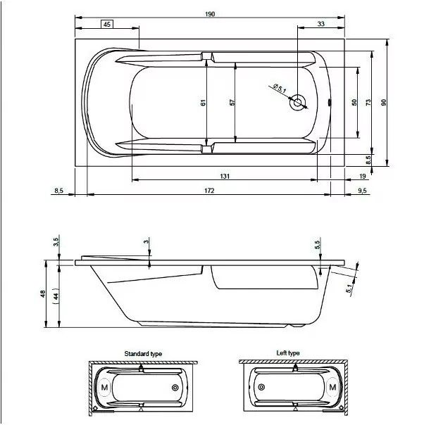 Конструкция ванны симметрична, поэтому может быть установлена в правом и левом углу.