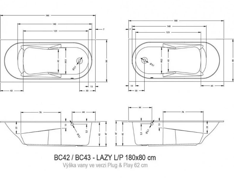 Прямоугольная? ванна RIHO Lazy 180x80 R Plug & Play, из глянцевого белого акрила с боковым сливом-переливом, представляет собой полностью собранную на заводе конструкцию.