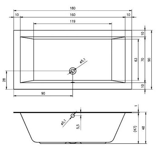 Дно широкое и почти полностью плоское, что позволяет удобно стоять в этой ванне.