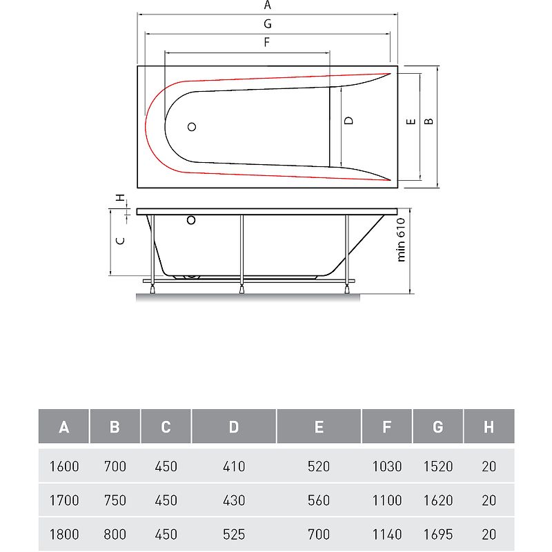 Высота ванны на каркасе: 61 см.