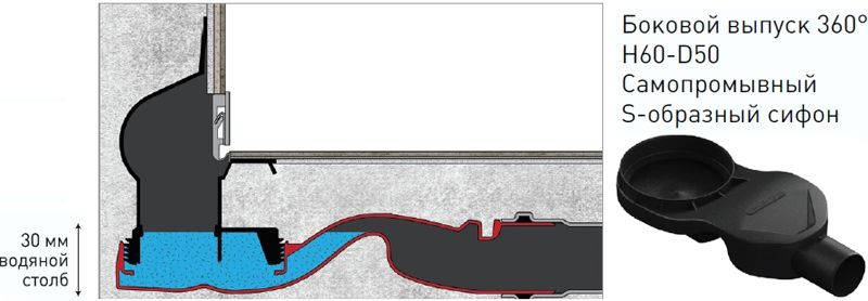 Самопромывный S-образный сифон РР: горизонтальный выпуск S-сифон D50, Н60 мм, регулировка по высоте, монтаж 360°.