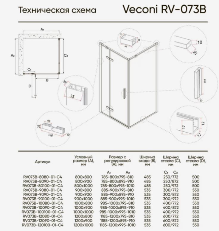 Боковая панель Veconi KP-07B, 1000x1950, черный, прозрачное стекло