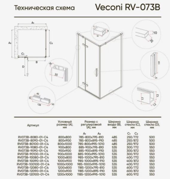 Боковая панель Veconi KP-07B, 1000x1950, черный, прозрачное стекло купить