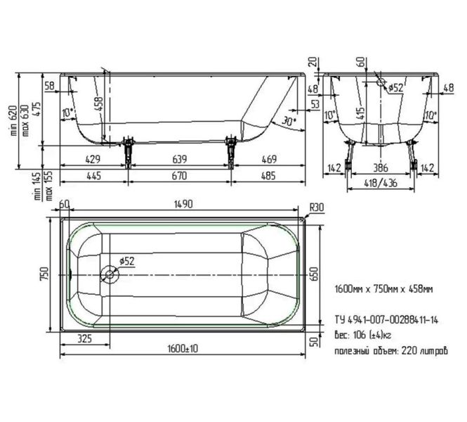 Start 1600x750Вотте Старт 1600х750х458 ванна чугунная (БП-э000001106)Габариты (д.ш.г.): 160x75x45,8 см