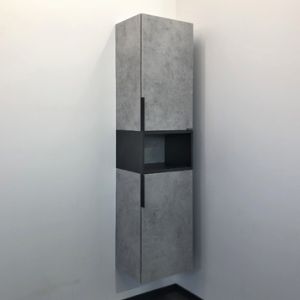 Подвесная шкаф колонна с двумя створками и пространством для открытого хранения. Створки оснащены петлями с плавным закрыванием и черными матовыми алюминиевыми ручками. За створками по две регулируемые по высоте полки. Шкаф-колонна универсальна, может быть подвешена переворачиванием в правом и левом варианте.