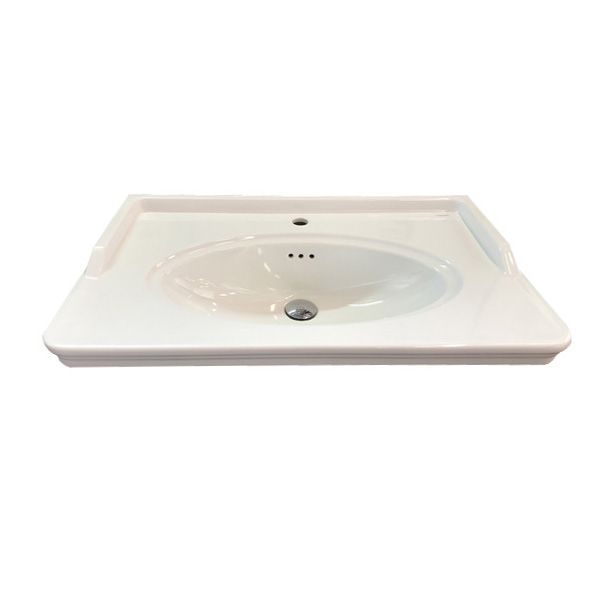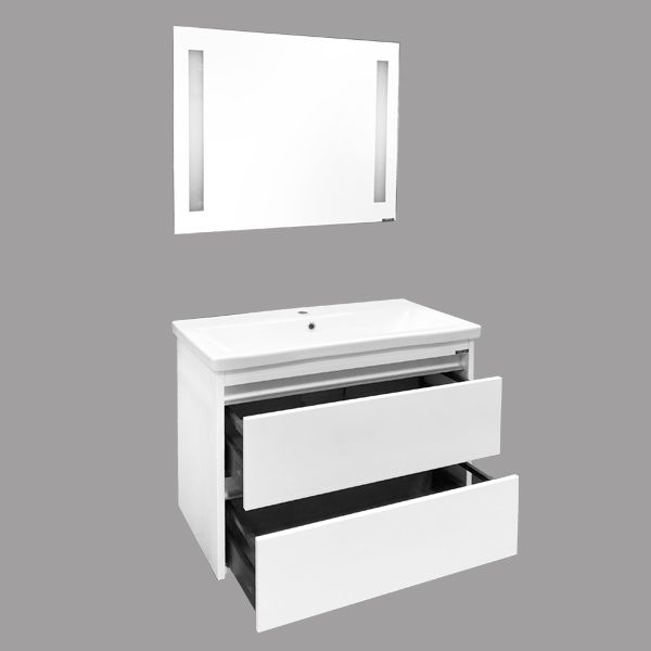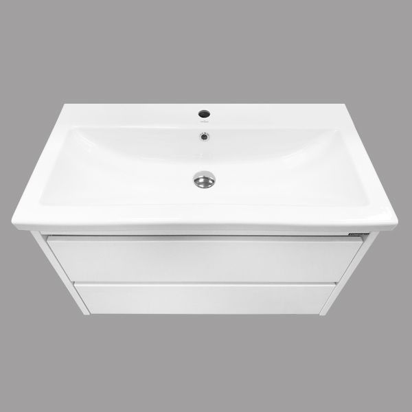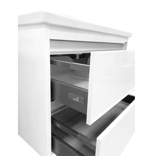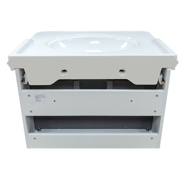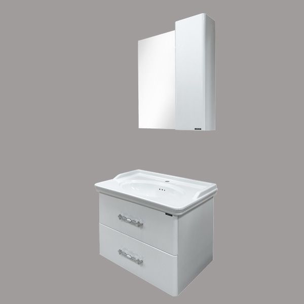 Тумба-умывальник с двумя выкатными ящиками, оснащенными системой плавного закрывания. Фасады выполнены из МДФ и покрыты белой глянцевой эмалью. Раковина столешница с овальной чашей и оригинальными отверстиями перелива.
