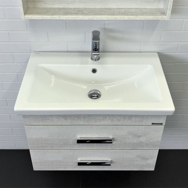 Тумба Comfortу Никосия-70П с раковиной Como 70, дуб белый, 00-00005792Подвесная тумба-умывальник с двумя выкатными ящиками. Ящики оснащены доводчиками для плавного закрывания. Корпус и фасады тумбы из влагостойкого ДСП актуальной фактуры "Дуб белый" с имитацией натурального дерева. Тумба укомплектована прямоугольной раковиной из санитарного фарфора и четырьмя ножками.Основные характеристики:Монтаж: подвесной
