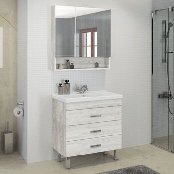 Название: Тумба-умывальник Артикул: Никосия 80Н Варианты цвета корпуса и фасадов: Дуб белый Материал корпуса и фасадов: влагостойкое ЛДСП Габариты (ШхВхГ): 800*860*450 мм Комплектация: раковина Fest 80 (санитарный фарфор) Напольная тумба с тремя выдвижными ящиками оснащенными системой плавного закрывания. Оригинальные эргономичные металлические ручки.