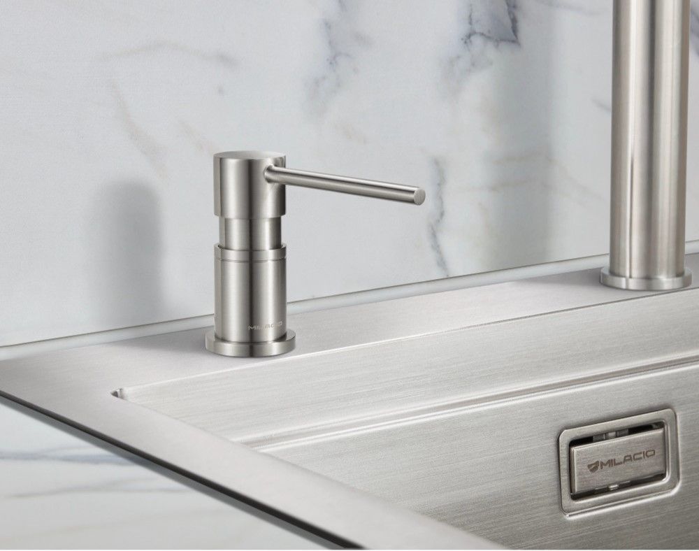 - Матовая текстура позволяет устанавливать дозатор Milacio как с каменными мойкам, так и в паре с мойками из нержавеющей стали любых брендов.
