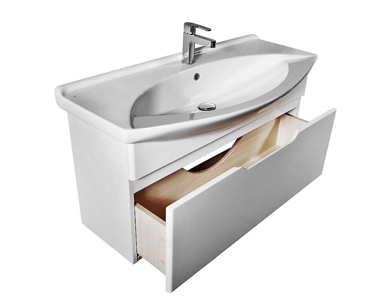 Подвесная классическая коллекция в 4-х размерах 65, 75, 85, 105 Лаконичный дизайн, глянцевая поверхность фасада, механизмы Hettich. Небольшая глубина тумбы органично впишется в любую, даже небольшую ванную комнату. Глубокий ящик