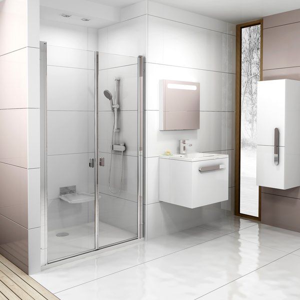 Идеальное решение для создания душевого пространства в нише с крайне широким входом до 102 cм. Двери открываются и вовнутрь душевого уголка, что позволяет его проветривать и тем самым избежать неприятных капель воды на полу.