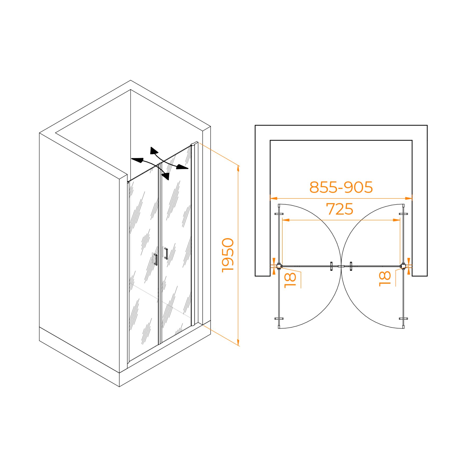 Душевая дверь распашная двустворчатая маятниковая. Маятниковые петли с функцией подъема двери. В комплекте нижняя пороговая планка. Трап или поддон приобретается отдельно.