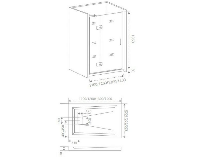 • - Прямые (от стены до стены, артикул WTW) – ограждения с одной открывающейся дверью: 1100, 1200, 1300, 1400 мм.