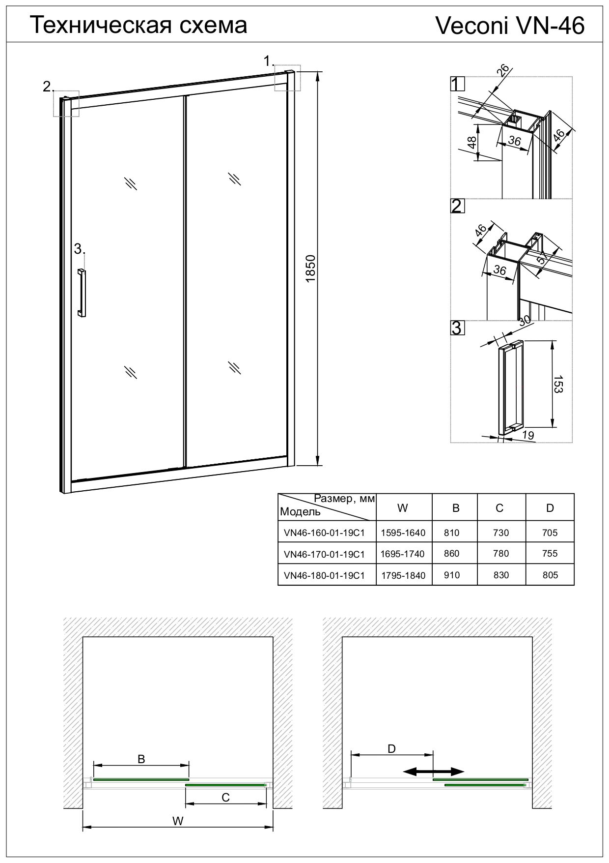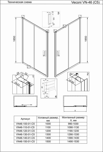 Душевая дверь Veconi Vianno VN-46, 1100x1950, хром, стекло прозрачное купить