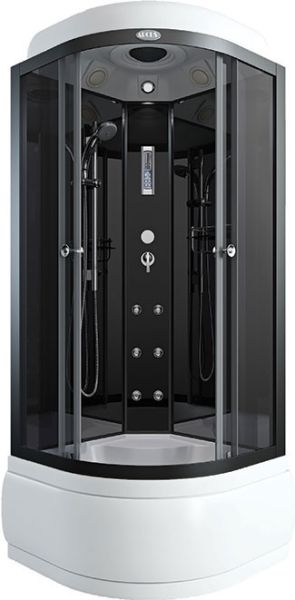 поддон высокий 45см фронтальные стекла серые тонированные задние стекла черные центральная панель стекло черное черный алюминиевый профиль регулируемые ролики хромированные ручки для дверей 3-х режимный смеситель ручная лейка на штанге 6 гидромассажных форсунок верхняя лейка «тропический душ» стеклянная полка пульт управления с функциями: радио, свет, вентилятор