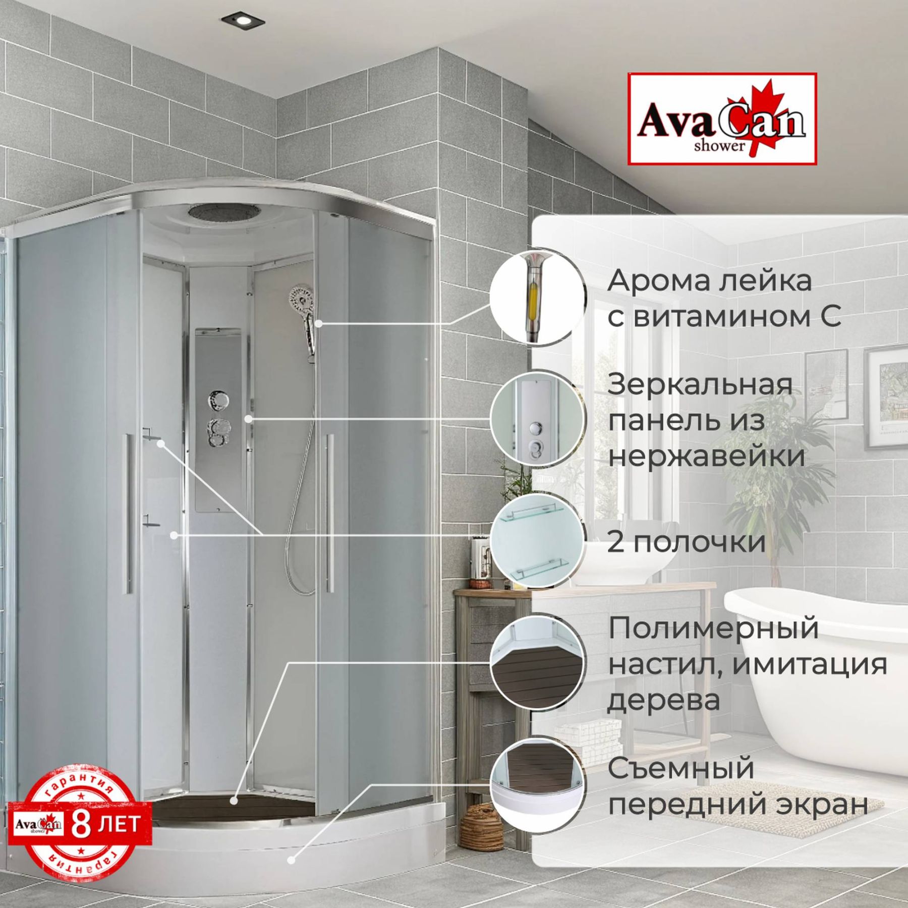 Стильная душевая кабина AvaCan EM2080 сочетает в себе высокую функциональность, практичность и надежность. При изготовлении применяется безопасное закаленное стекло толщиной 5 мм (матовое), надежно фиксируемое алюминиевым профилем. Сборка без силикона (увеличивает срок службы), внутренняя сборка(облегчает установку и ревизию; позволяет установить в ограниченном пространстве), смеситель резьбовой (без хомутов). Съемный экран поддона (позволяет осуществлять ревизию сифона). Цвет профиля  хром. Двойные металлические ролики дверей (увеличивают срок службы).В комплекте : душевая штанга, две полочки , тропический (верхний) душ, арома-лейка с витамином С (картридж съемный),полимерная вставка в поддон(имитация дерева),сифон, ручки дверей из нержавейки , двойные ролики .