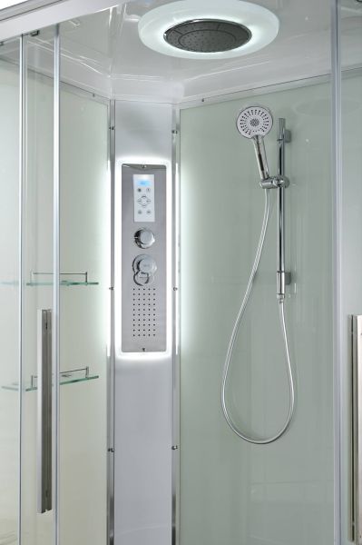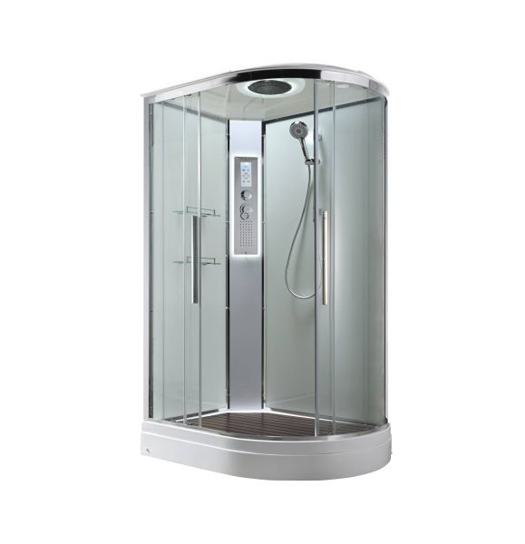 Стильная душевая кабина AvaCan EM2912LLEDT сочетает в себе высокую функциональность, практичность и надежность. При изготовлении применяется безопасное закаленное стекло толщиной 5 мм (прозрачное), надежно фиксируемое алюминиевым профилем. Сборка без силикона (увеличивает срок службы), внутренняя сборка(облегчает установку и ревизию; позволяет установить в ограниченном пространстве), смеситель резьбовой (без хомутов). Съемный экран поддона (позволяет осуществлять ревизию сифона). Цвет профиля  хром. Двойные металлические ролики дверей (увеличивают срок службы).В комплекте : душевая штанга, две полочки , тропический (верхний) душ, арома-лейка с витамином С (картридж съемный),полимерная вставка в поддон(имитация дерева),сифон, ручки дверей из нержавейки , двойные ролики ,пульт сенсорный(Блютуз ,LED подсветка ,радио ,вытяжка),гидромассаж спины.