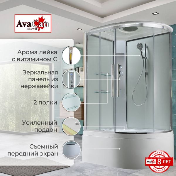 Стильная душевая кабина AvaCan сочетает в себе высокую функциональность, практичность и надежность. При изготовлении применяется безопасное закаленное стекло, надежно фиксируемое алюминиевым профилем. Профиль сделан из алюминия повышенной прочности. Сборка без силикона (увеличивает срок службы, защищает от протечек), внутренняя сборка (облегчает установку и ревизию; позволяет установить в ограниченном пространстве и обойтись без демонтажа других сантехнических приборов), смеситель резьбовой (без хомутов). Съемный экран поддона (позволяет осуществлять подключение и ревизию сифона).Двойные металлические ролики дверей (распределение нагрузки на два ролика, увеличивают срок службы). Душевая штанга(позволяет регулировать по высоте ручную лейку), ручная арома-лейка с витамином С (картридж в комплекте,есть возможность замены или удаления картриджа), полочки(из стекла, с ограничителем), сифон с гидрозатвором.