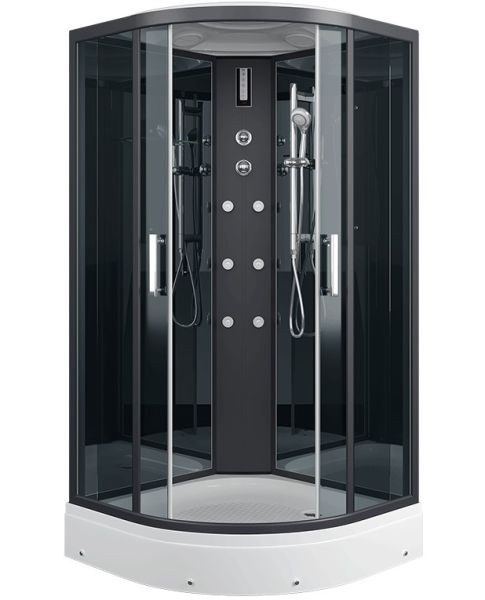 Центральная стойка черная, пластик"тропический душ, ручной душ 3х режимный, гидромассаж (кол-во форсунок 6 шт), верхний свет, сенсорный пульт, FM-радио, вентилятор, зеркало, полочка, рейлинг для душ-лейки.