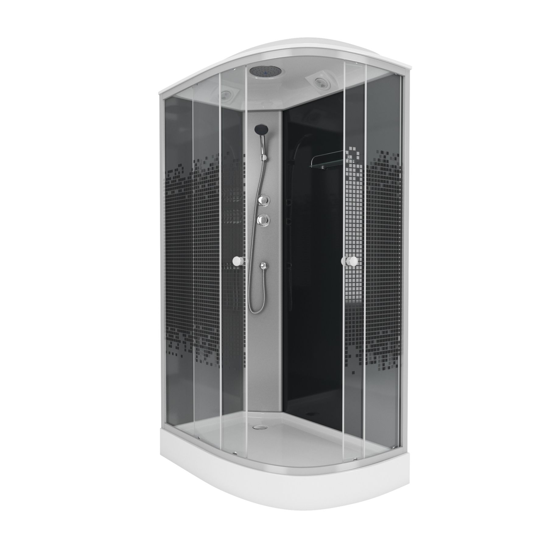 рисунок - мозаика, вентиляция, смеситель 2-х режимный, тропический душ, ручной душ, одинарные ролики