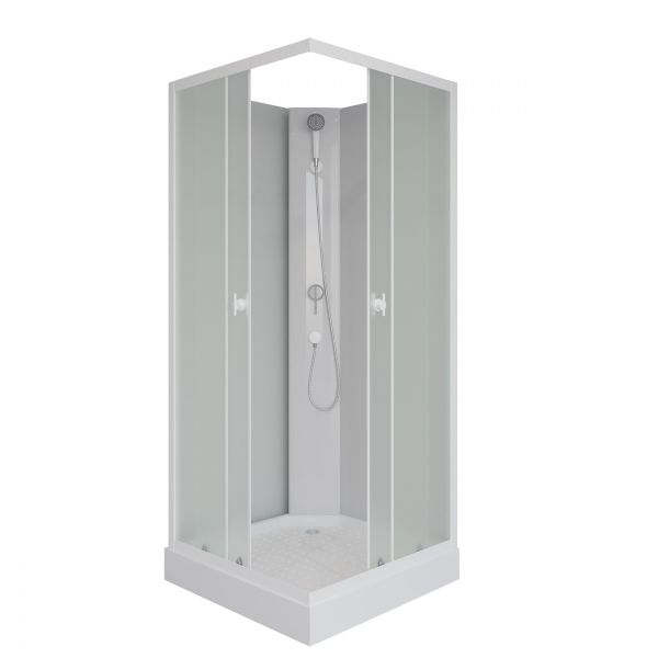 Душевая кабина, в простой комплектации серия Promo, основные функции ручная лейка. Поддон акриловый на железном каркасе, высота поддона от пола 15 см, внутренняя глубина чаши 5 см. Чаша поддона установлена на металлический каркас, с регулируемыми ножками. Нагрузка на поддон до 300 кгСтенки задние закаленное стекло 4 мм - белое матовое.Стенки передние закаленное стекло 4 мм - белое матовое.Смеситель латунь с керамическим картриджем (устойчивый к плохой воде - гарантия 10 лет)На крыше расположен тропический душ.Ручная лейка устанавливается на любую высоту (держатель в комплекте)