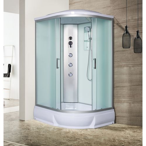 ~ крыша ~ верхний душ ~ вентиляц. отв-я(2шт) ~ центр.стойка ~ смеситель с переключ. режимов. ~ 3 г/м форс. ~ штанга ~ ручной душ 3х режимн. ~ полочка ~ зеркало ~ поддон п/кр. низ.с/съем. экр.(Н=26см) ~ сифон