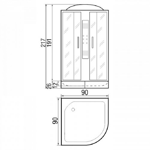 ~ крыша ~ верхний душ ~ вентиляц. отв-я(2шт) ~ центр.стойка ~ держатель д/лейки ~ ручной душ 3-х позиц. ~ полочка-3 шт. ~ смеситель с переключ. режимов ~ поддон п/кр.низ со съемн.экр. (Н=26см) ~ сифон