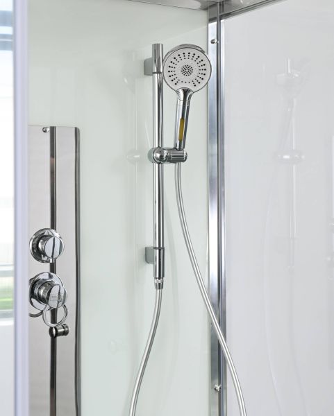 Стильная душевая кабина AvaCan сочетает в себе высокую функциональность, практичность и надежность. При изготовлении применяется безопасное закаленное стекло, надежно фиксируемое алюминиевым профилем. Профиль сделан из алюминия повышенной прочности. Сборка без силикона (увеличивает срок службы, защищает от протечек), внутренняя сборка (облегчает установку и ревизию; позволяет установить в ограниченном пространстве и обойтись без демонтажа других сантехнических приборов), смеситель резьбовой (без хомутов).Двойные металлические ролики дверей (распределение нагрузки на два ролика, увеличивают срок службы). Душевая штанга(позволяет регулировать по высоте ручную лейку), ручная арома-лейка с витамином С (картридж в комплекте,есть возможность замены или удаления картриджа), полочки(из стекла, с ограничителем), сифон с гидрозатвором.
