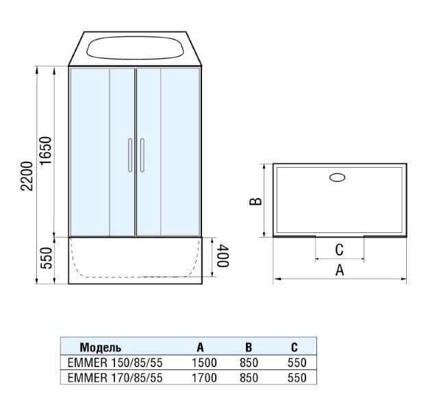 Душевая кабина WW500 EMMER 150/85/55-2 1500х850х2200 с поддоном