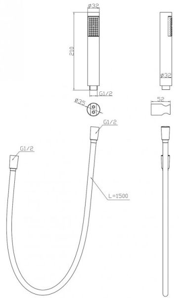 Оснащение: держатель, шланг, ручной душ нержавеющая сталь