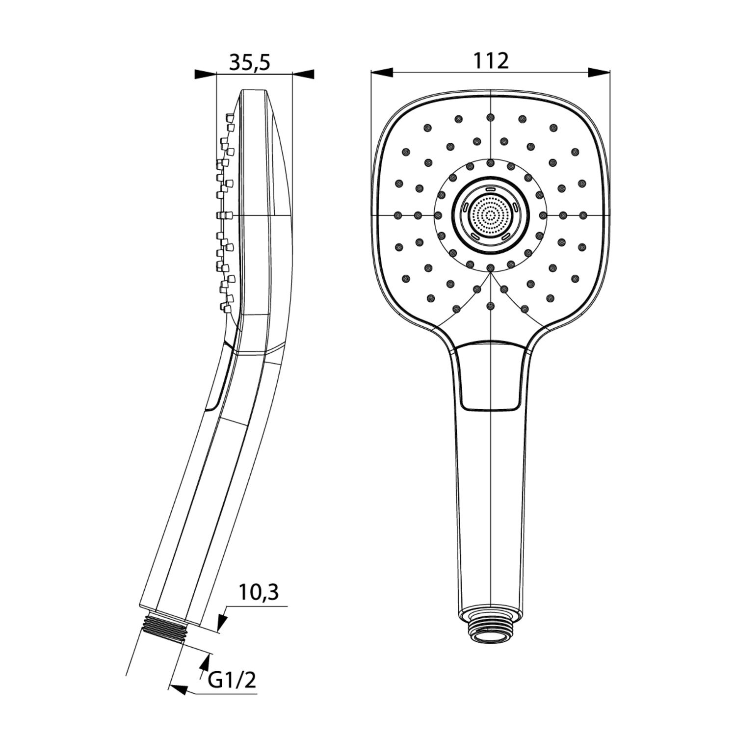 Лейка для душа из ABS-пластика, 3 режима (Rain, Relax-Massage, Rain&Relax-Massage), кнопочное переключение режимов, встроенная мембрана из нержавеющей стали, размер 112х255 мм, цвет - белый/хром.