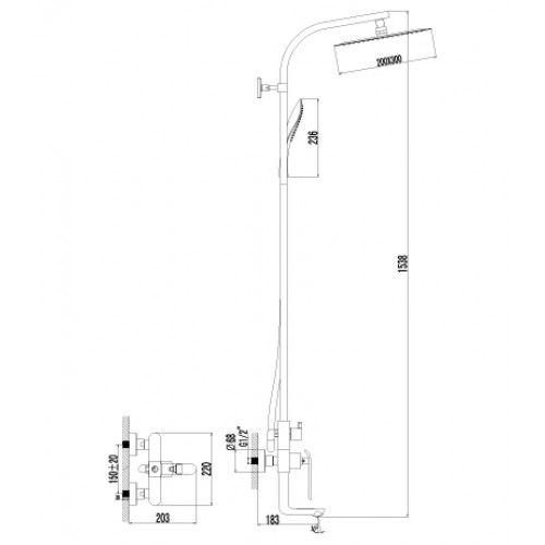 Артикул LM4962CWСмеситель для ванны и душа с фиксированной высотой штанги, поворотным изливом и верхней душевой лейкой "Тропический дождь"
