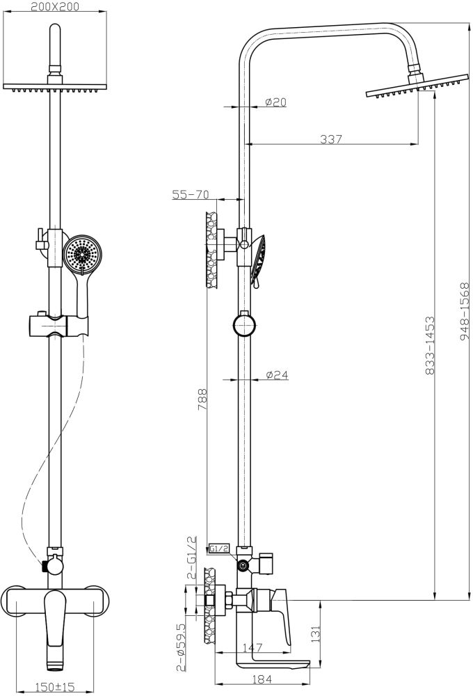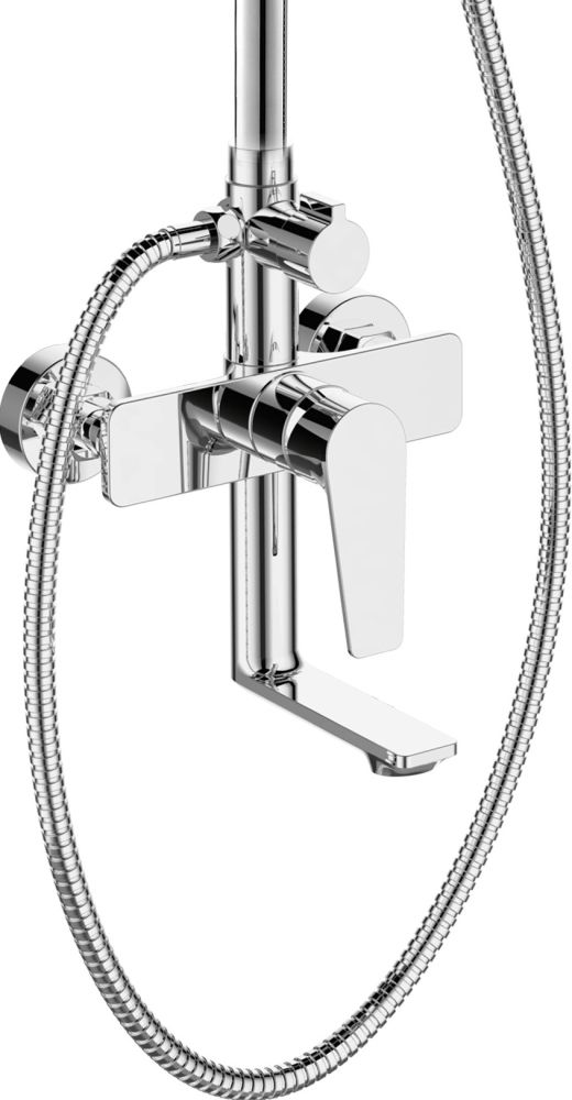 Agger Brilliant A0393300 Душевая система со смесителем для ванны/душа (керамический картридж, поворотный излив 18,4 см): пятирежимный ручной душ 120 мм с регулируемым по высоте и наклону держателем, верхний душ 200 мм с регулировкой угла наклона и силиконовыми наконечниками (защита от известкового налета), телескопическая штанга, шланг 150 см. с защитой от перекручивания.
