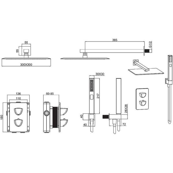 Верхний душ: 30х30 см.