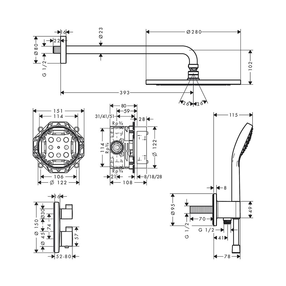 Состоит из: верхний душ, ручной душ, держатель верхнего душа, термостат, скрытая часть, настенный вывод, шланг для душа.